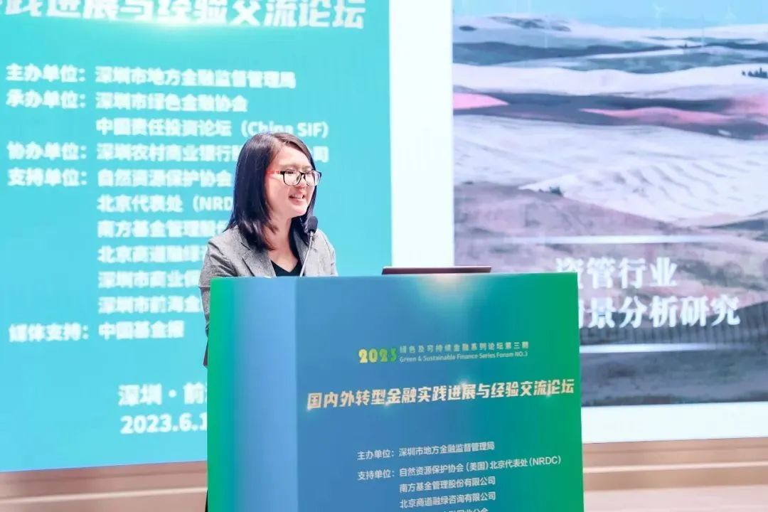 6月16日,深圳市地方金融监督管理局举办了“国内外转型金融实践进展与经验交流论坛”。该活动由深圳市绿色金融协会和中国责任投资论坛(China SIF)承办、深圳农商行协办,南方基金、商道融绿、自然资源保护协会(NRDC)等单位提供支持。中国责任投资论坛(China SIF)理事长、商道融绿董事长郭沛源的主持“国内金融机构践行转型金融”圆桌论坛,商道融绿机构服务副总监毕连珊在会上发布《资管行业气候情景分析研究》报告。